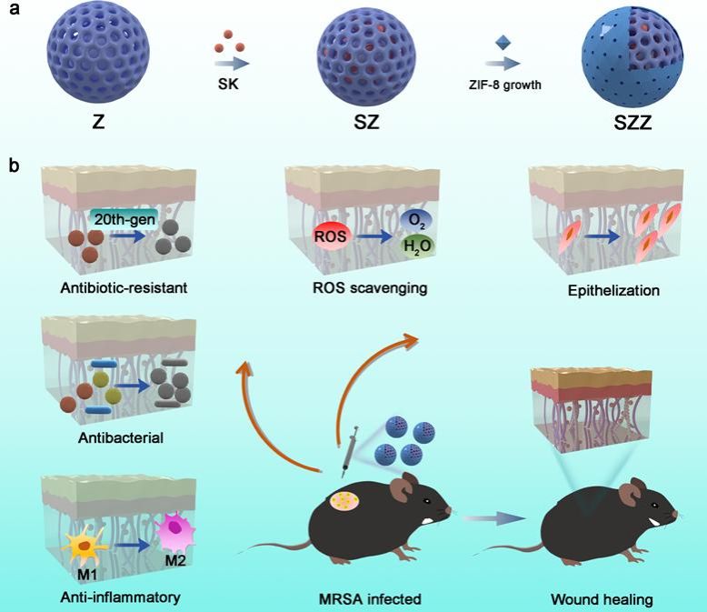 MOF异质结微反应器构筑及促伤口愈合示意图