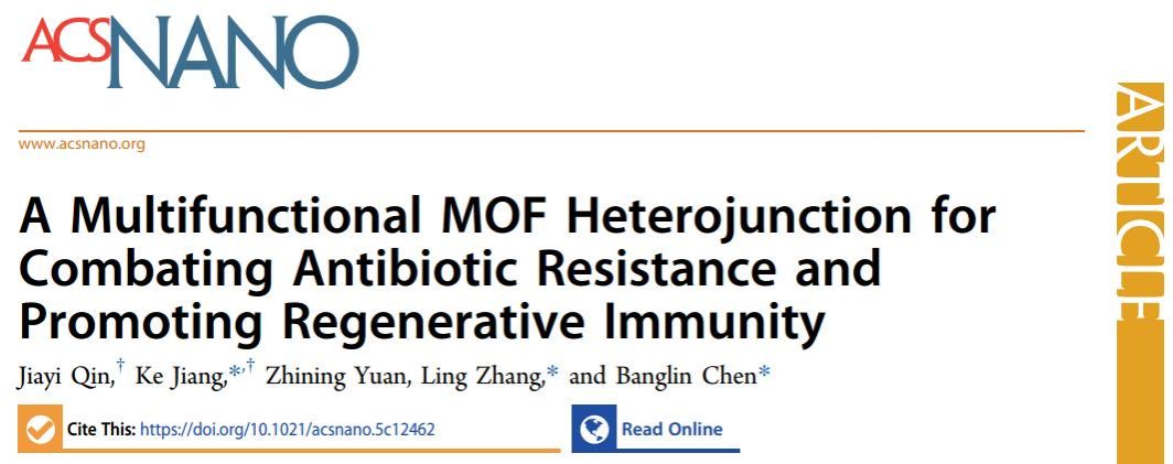 此次研究得到国家自然科学基金和海南省国际科技合作重点研发项目的支持,相关成果以“A Multifunctional MOF Heterojunction for Combating Antibiotic Resistance and Promoting Regenerative Immunity”为题,发表在纳米科技领域顶级期刊《ACS Nano》(IF=16.1)。论文第一作者为明升体育2022级硕士研究生覃家宜,通讯作者为姜珂副研究员、张玲副教授和福建师范大学陈邦林教授。